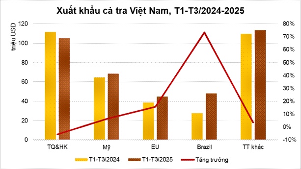 Theo Cục Hải quan Việt Nam, trong tháng 3, xuất khẩu cá tra sang các thị trường tiếp tục tăng trưởng dương 16%, đạt 182 triệu USD. Lũy kế xuất khẩu cá tra quý I/2025 đạt hơn 465 triệu USD, tăng 13% so với cùng kỳ năm ngoái.
