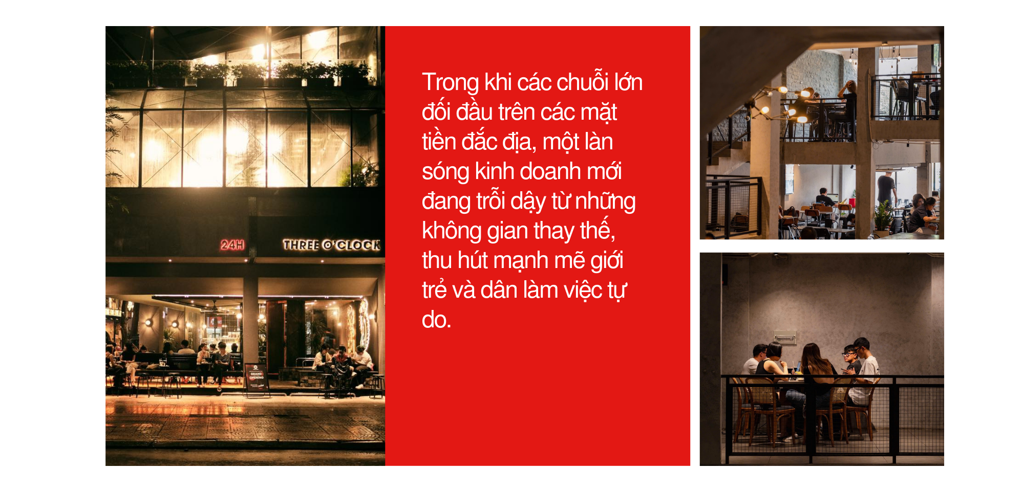 Trong khi các chuỗi lớn đối đầu ở các mặt tiền đắc địa, một làn sóng kinh doanh mới đang trỗi dậy từ những không gian thay thế, thu hút mạnh mẽ giới trẻ và dân làm việc tự do. Mô hình cà phê 24/7 như Three O’Clock, Thức Coffee, Kai Coffee… đáp ứng nhu cầu làm việc và học tập xuyên đêm tại các thành phố lớn, tạo ra một phân khúc gần như độc quyền, phục vụ những khách hàng “cú đêm”.