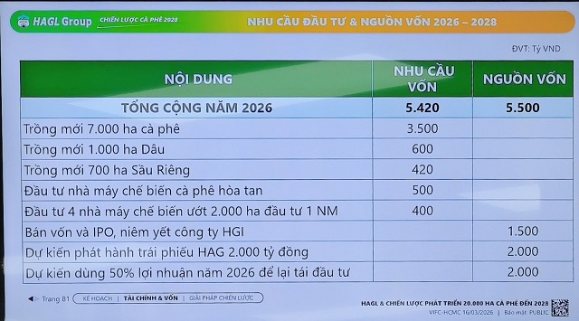 Tổng nhu cầu vốn cho giai đoạn 3 năm (2026 – 2028) để phát triển cà phê và các mảng phụ trợ là 14,220 tỷ đồng. Ông Thắng cho biết chiến lược tài chính của HAG là huy động những nguồn lực từ cả bên trong và bên ngoài.