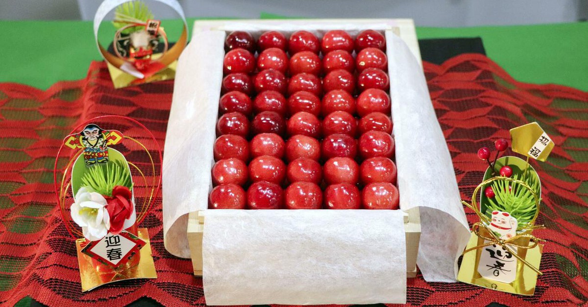Thùng anh đào ‘siêu mắc’ được bán trong khuôn khổ các phiên đấu giá đầu năm, các nhà vườn Nhật Bản đã dùng phương pháp ‘siêu ép trái’ để kịp thu hoạch. Ảnh chụp thùng anh đào 1,55 triệu yen được đấu giá tại tỉnh Yamagata, Nhật Bản ngày 5-1 – Ảnh: KYODO Theo Hãng…